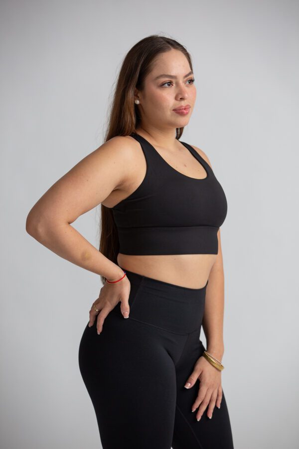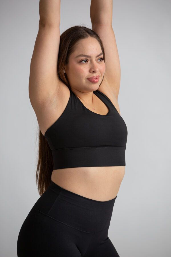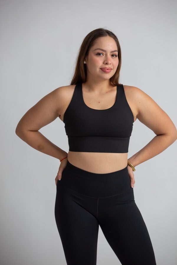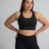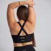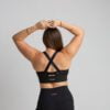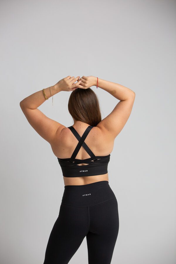 Brasier deportivo de mujer de alta sujeción. Detalle de espalda cruzada. Cuenta con copas de relleno extraíble. Tela de alta resistencia y de secado rápido.